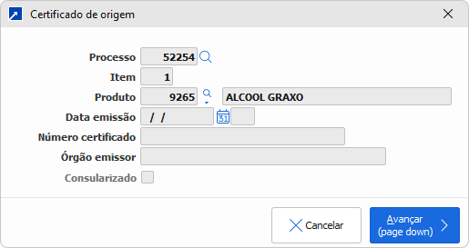 Botão que abre a janela com dados referentes ao certificado de origem do item.