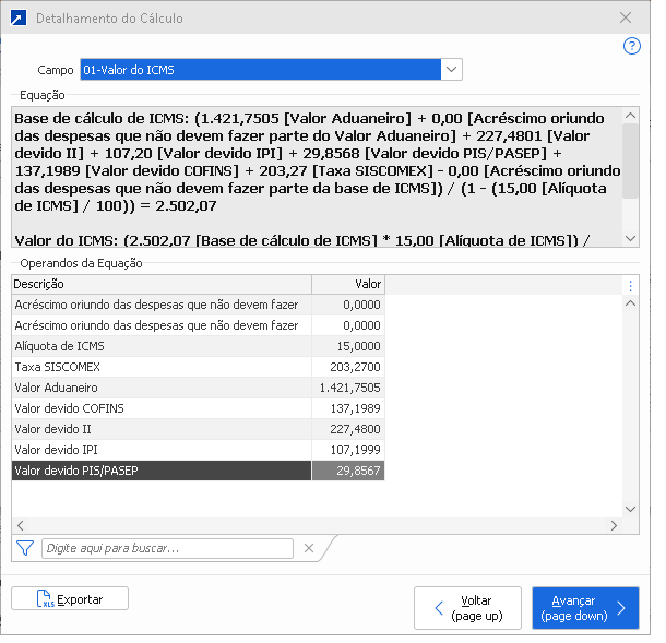 Valores e cálculos do Imposto sobre Circulação de Mercadores e Serviços (ICMS).
