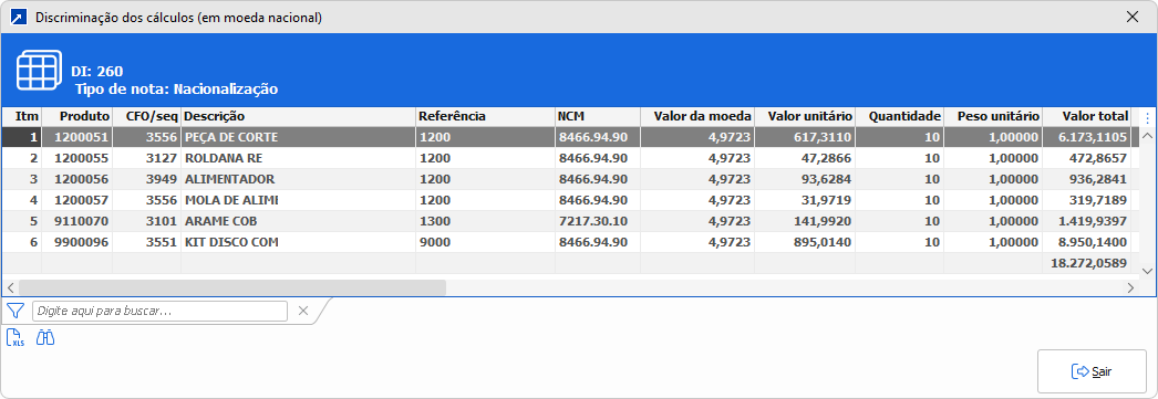 Exibe um grid simulando os itens de uma nota, detalhando valores em moeda nacional para uma geração de nota.