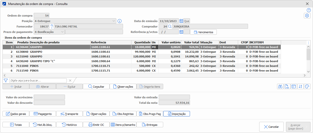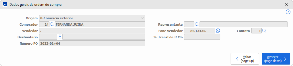 Há também o botão [Importação], este se refere às informações gerais da PO (imagem abaixo).