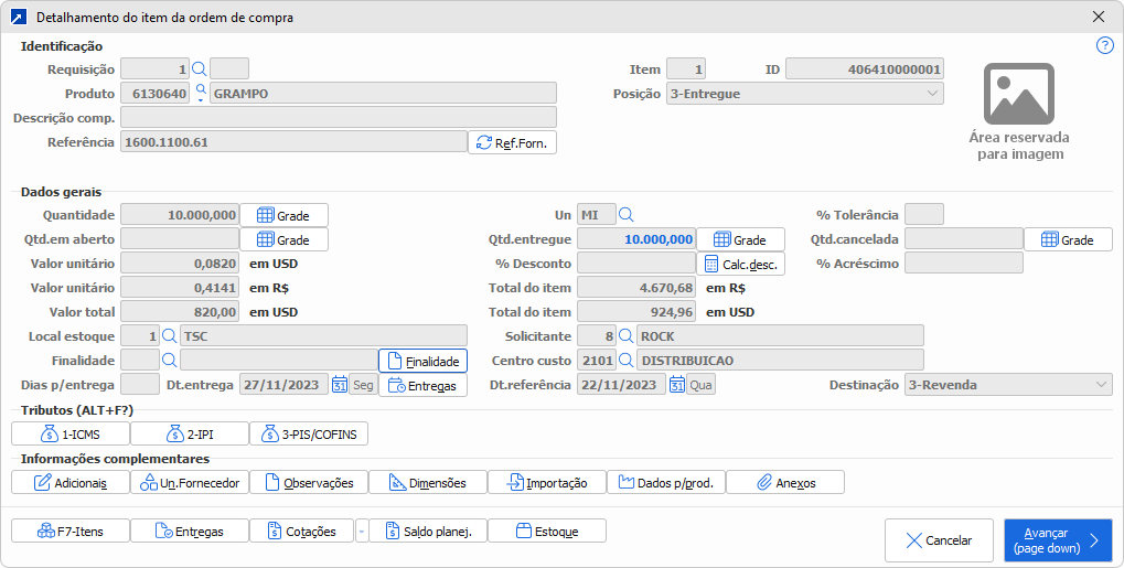 Na manutenção do item da PO será exibido um botão denominado [Importação], onde serão preenchidas informações pertinente ao produto (item) que está sendo importado.