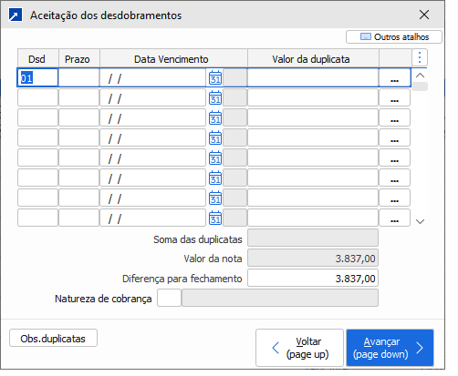 Ao avançar para a segunda tela informe os novos desdobramentos e a nova data de vencimento.