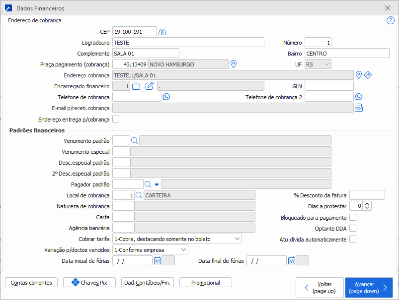 Descrição: No cadastro de clientes/fornecedores é possível informar um período de férias, de modo que o sistema impeça a geração de faturas com vencimentos dentro desse intervalo.