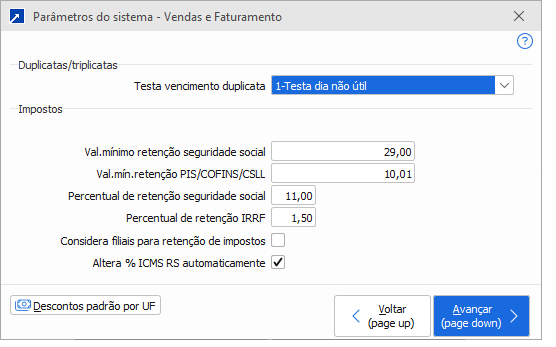 Importante: A funcionalidade somente opera se o sistema estiver configurado para testar "vencimento de duplicata em dia não útil".