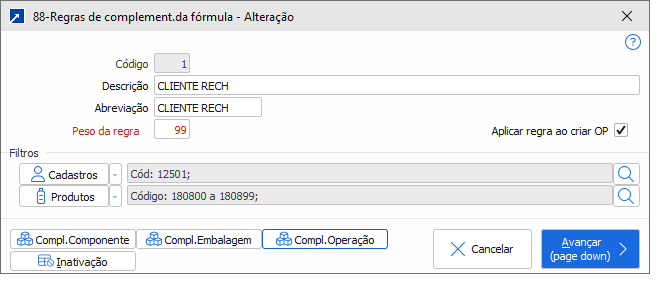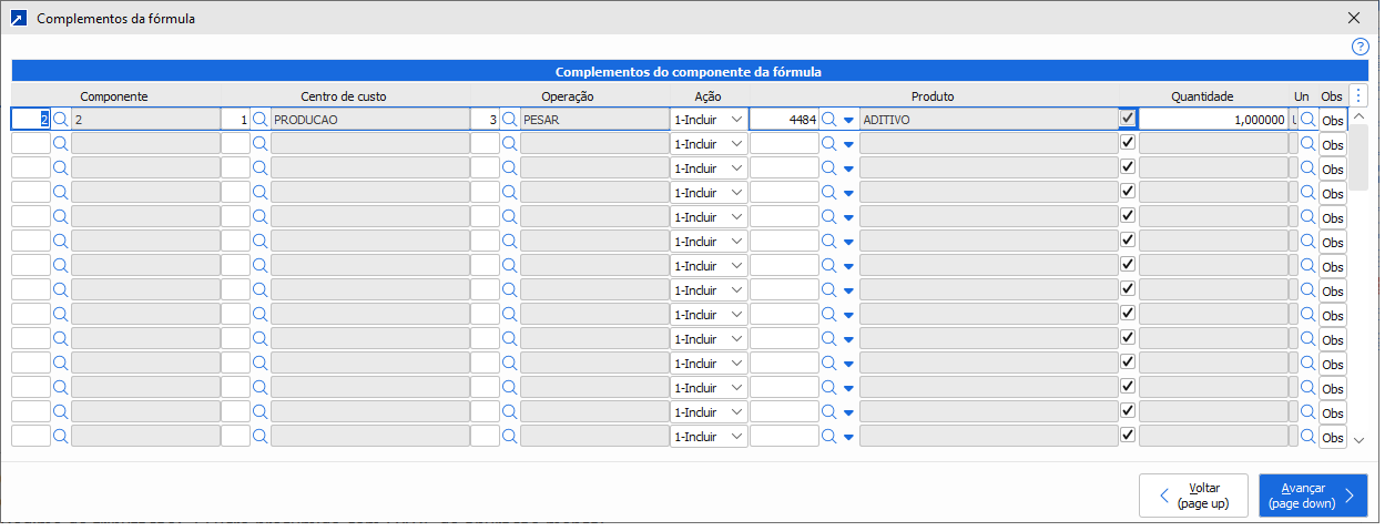 Complemento de componente: O cliente exige que na composição da fórmula do produto contenha um aditivo específico na sua composição. Para atender essa necessidade foi cadastrada a regra abaixo que inclui o insumo "4484-ADITIVO" vinculado ao componente "2-2"no centro de custo "1-PRODUCAO" e na operação "3-PESAR".