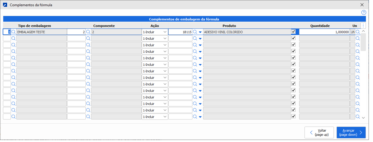 Complemento de tipo de embalagem: O cliente exige que na embalagem do seu produto exista um adesivo para identificação. Para atender essa necessidade foi cadastrada a regra abaixo que inclui o insumo "18115-ADESIVO VINIL" vinculado ao componente "2-2" quando o produto é acondicionado utilizando o tipo de embalagem "2-EMBALAGEM TESTE".