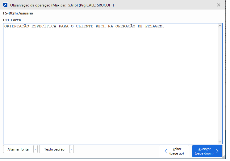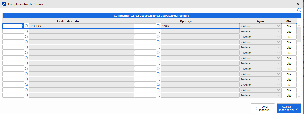 Complemento de operação: Devido as especificidades do cliente foi necessário adicionar orientações aos operadores no processo fabril. Para atender essa necessidade foi cadastrada uma observação específica para orientar os operadores na execução da operação "3-PESAR" do centro de custo "1-PRODUCAO".