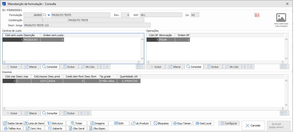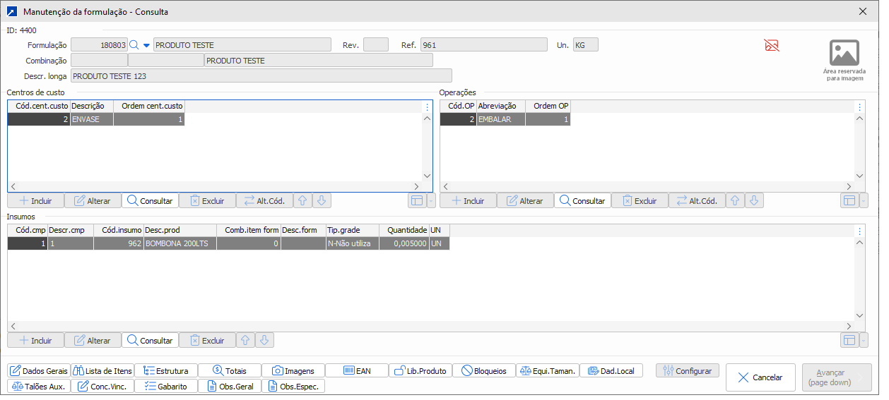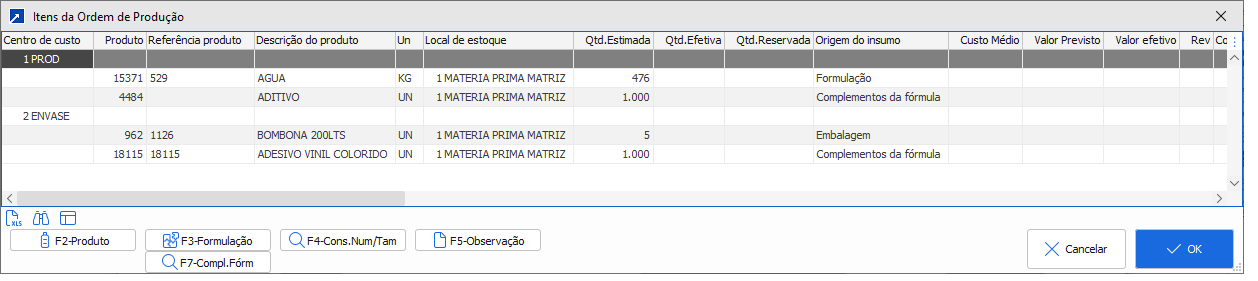 Conforme é possível visualizar na listagem de insumos acima, foram incluídos insumos com origem a partir das regras de Complementos da fórmula para os centros de custo "1-PROD" e "2-ENVASE". Ao observar o cadastro da fórmula do produto pronto e do acondicionamento, temos: