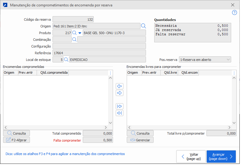 Observação: a quantidade comprometida e saldo comprometer, não controlam grade, apenas a quantidade.