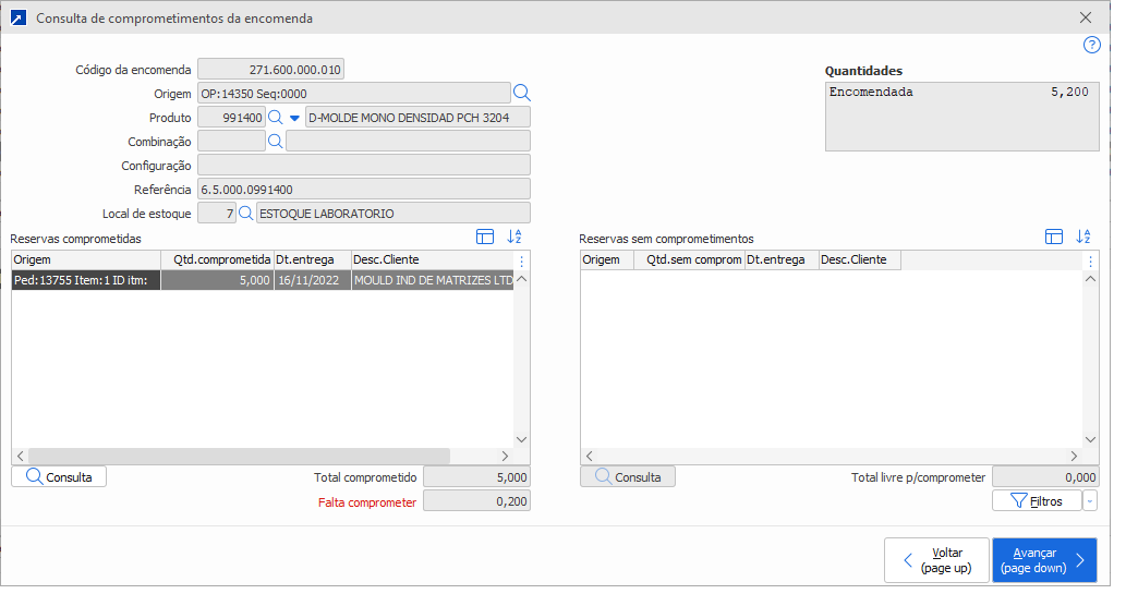 Exibe as encomendas comprometidas com a necessidade de reserva