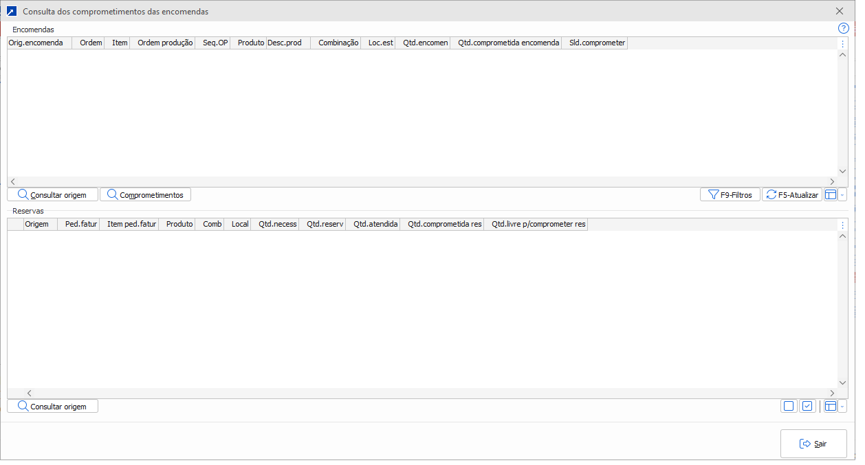 Através do módulo de Estoque, menu EST 2.B-O está disponível a janela consolidada de consulta dos comprometimentos da encomendas em aberto.