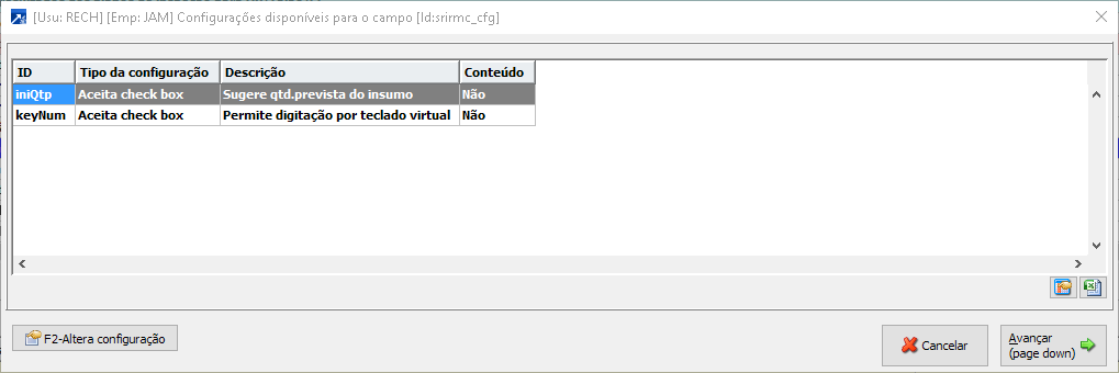 'Colunas aceitas na tabela de conferência de insumos': Permite configurar quais colunas devem ser exibidas.