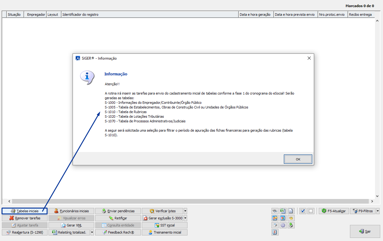 No gerenciador de envio, menu FPA 7.8-V, clicar no botão [Tabelas iniciais] e informar a competência para gerar o layout S-1010. Desta forma, o SIGER® vai gerar os eventos que foram utilizados na competência.