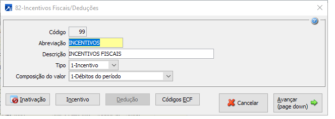 * [Códigos ECF] - deverá informar os códigos da ECF para os incentivos/deduções, conforme tabela da Receita Federal.