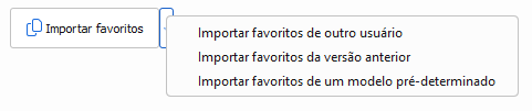 O botão [Importar favoritos] oferece três opções: importar favoritos de outro usuário, importar favoritos de um modelo pré-determinado e importar favoritos da versão anterior.