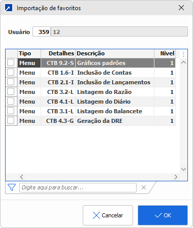 Importar favoritos da versão anterior: Esta opção abre uma janela que exibe um grid, onde é possível ver os favoritos salvos da versão anterior do SIGER® e selecionar quais deseja importar.