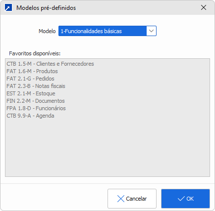 Importar favoritos de um modelo pré-determinado: Esta opção abre a janela onde você pode importar favoritos de um modelo pré-determinado. Na janela, há um campo chamado "Modelo" com as opções de modelos disponíveis. Abaixo, é exibido um pré-visualizador que mostra os favoritos que serão adicionados.