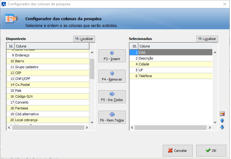 Exibe a janela abaixo, onde é possível configurar quais colunas devem ser visíveis na pesquisa, bem como a ordem em que as mesmas aparecem.