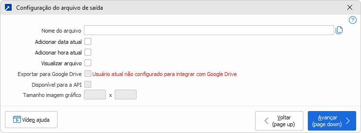 - Tamanho imagem gráfico: Habilitado quando o formato de saída é gráfico. Largura x altura da imagem gerada. Quando nada é informado, assume o padrão 1800 x 950.