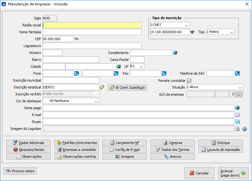 No cadastro da empresa do módulo de estoque são feitas as seguintes configurações: