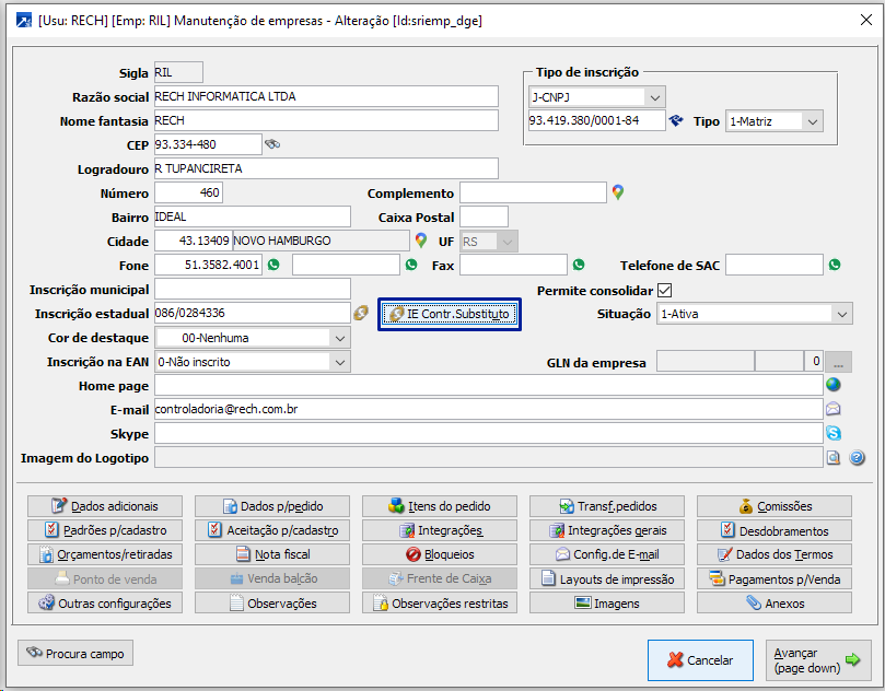 A indicação da IE de substituto é feita na empresa do Faturamento, menu 1.2-A, botão <IE Contr.Substituto>