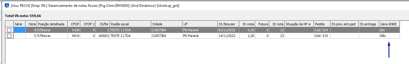 IMPORTANTE: A coluna “Gera GNRE” não muda de situação após geração da GNRE pelo menu 3.5-N, ela é apenas um indicativo da necessidade da nota de ter pagamento adiantado do ICMS.