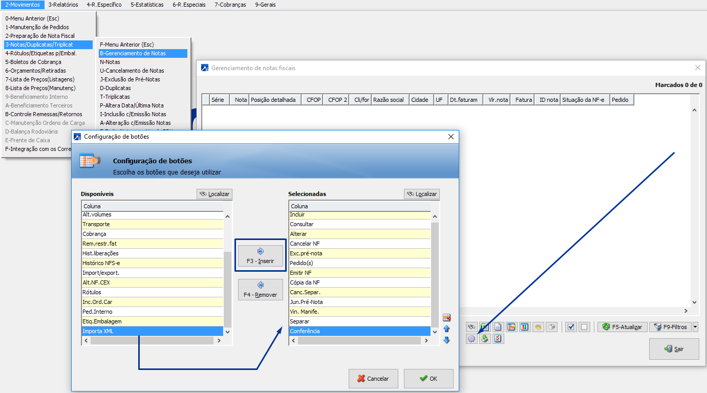 A inclusão do botão é um procedimento simples, basta acessar a configuração de botões e passar o campo "Importa XML" da coluna "Disponível" para a coluna "Selecionadas" conforme imagem abaixo: