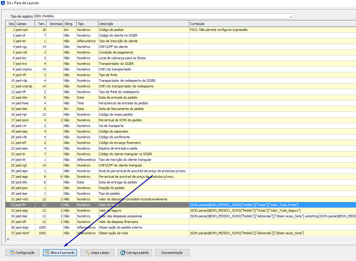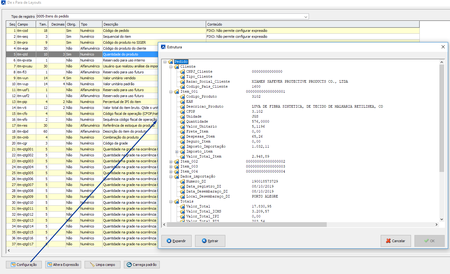 PASSO 1: Escolher o tipo de registro 0005 (Itens do pedido) e localizar o campo "Quantidade do Produto"