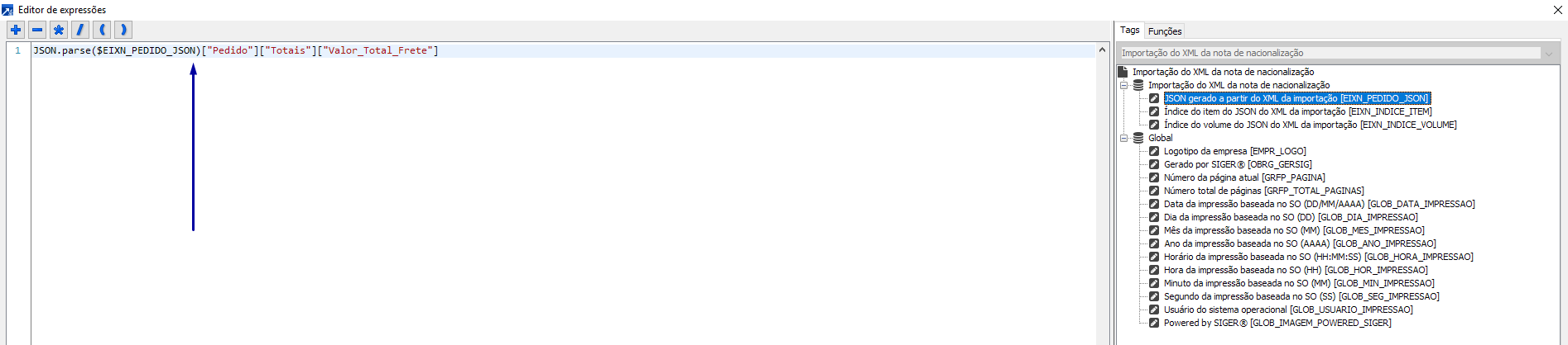Exemplo de uso de expressão: Indicar qual campo do arquivo xml virão os dados do valor do frete.