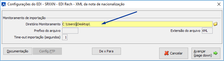 No campo "Diretório para Monitoramento" será necessário informar o diretório onde está salvo o arquivo .xml contendo o "espelho" da NF.