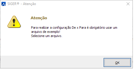 Após clicar no botão <De x Para> o SIGER® irá avisar que para executar é necessário informar um arquivo "exemplo".