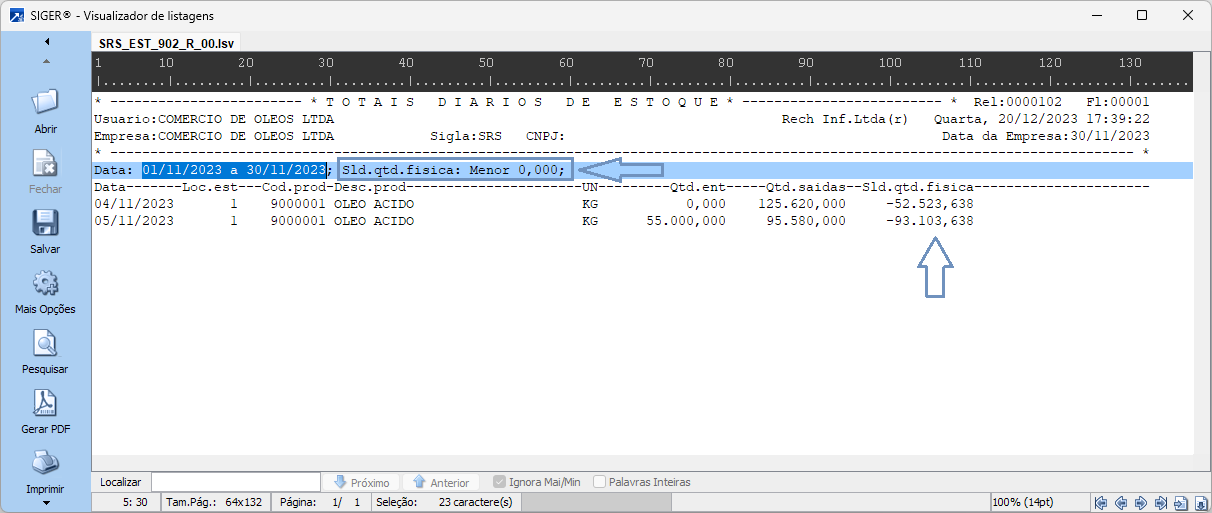 - Filtrar apenas "Saldo de quantidade física" menor que "0" (zero), dessa forma só exibe no relatório os dias em que o saldo ficou negativo.