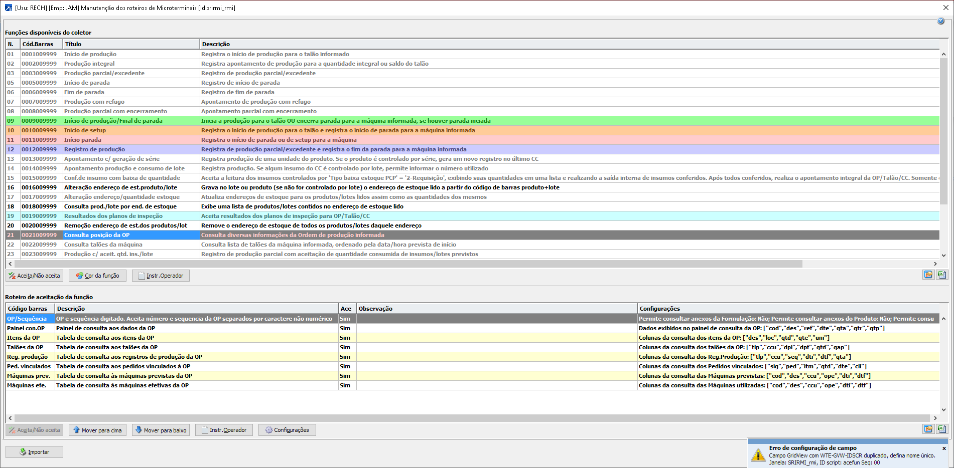 Tabela com os registros de produção da OP consultada. As colunas a serem exibidas podem ser configuradas conforme imagem abaixo.