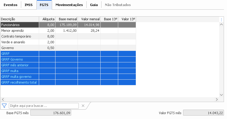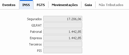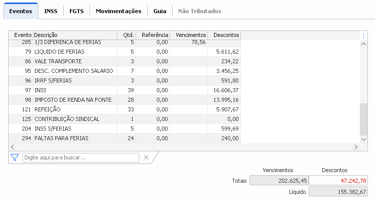 Selecionando um registro de funcionário na tela da esquerda, será exibido os valores relacionados, discriminados por evento.