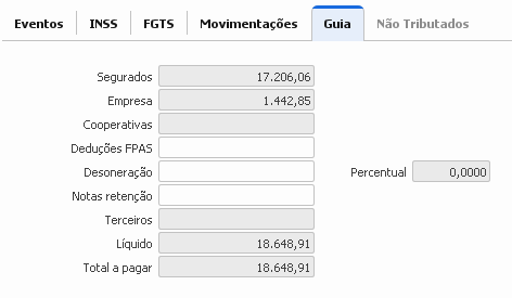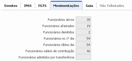 Na opção de totais, permite consultar os totais da folha de pagamento por filial, exibindo detalhes como INSS, FTGS, movimentações, guias e eventos não tributados.