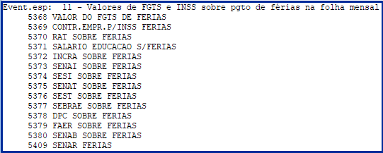 Os eventos são padrões do SIGER®, e devem ser baixados da conta de provisão coluna "Pg.cont.Mês" do menu FPA 4.9-R e deve ser incluído o lançamento na contabilização a débito na conta de provisão do passivo, menu FPA 4.A-I.