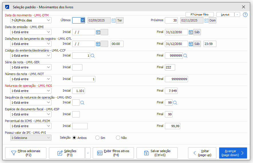Após definirmos os parâmetros do relatório, teremos a seleção de filtros para os resultados: