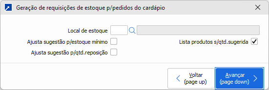 A geração de Requisições de Estoque para Pedidos do Cardápio está disponível no menu B-Gestão de Cardápios (CST) 2.5-G-Geração de Requisição de Estoque p/Pedidos.