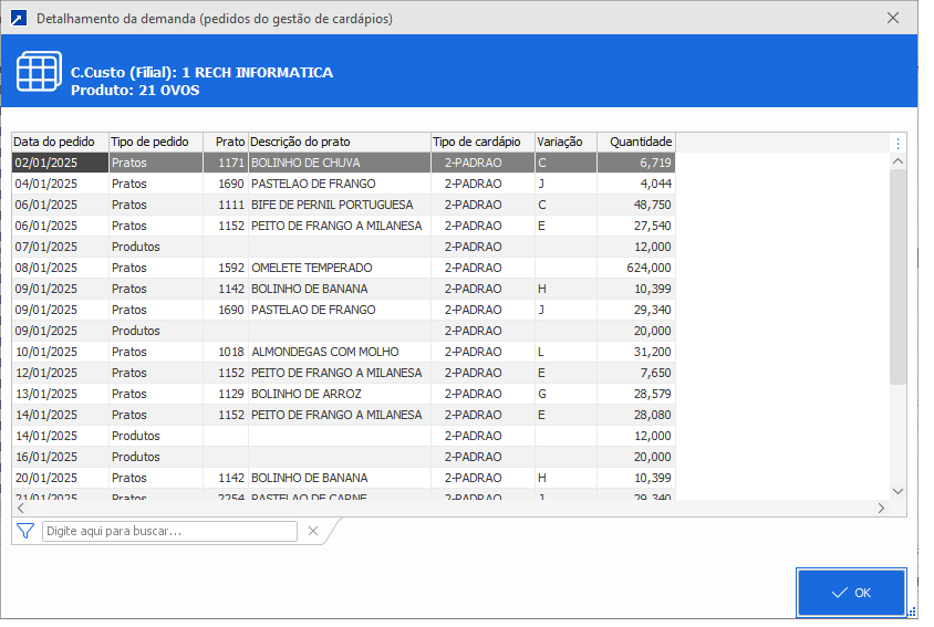 A rotina percorrerá os itens do pedido, agrupando-os por centro de custo (filial), produto, descrição da gramagem e quantidade da gramagem (estas duas últimas quando configuradas no produto).