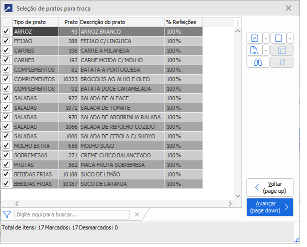 Permite o usuário selecionar qual tipo de prato deve ser trocado entre os dias.