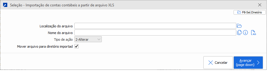 A importação das contas contábeis sempre será com ação "2-Alterar".