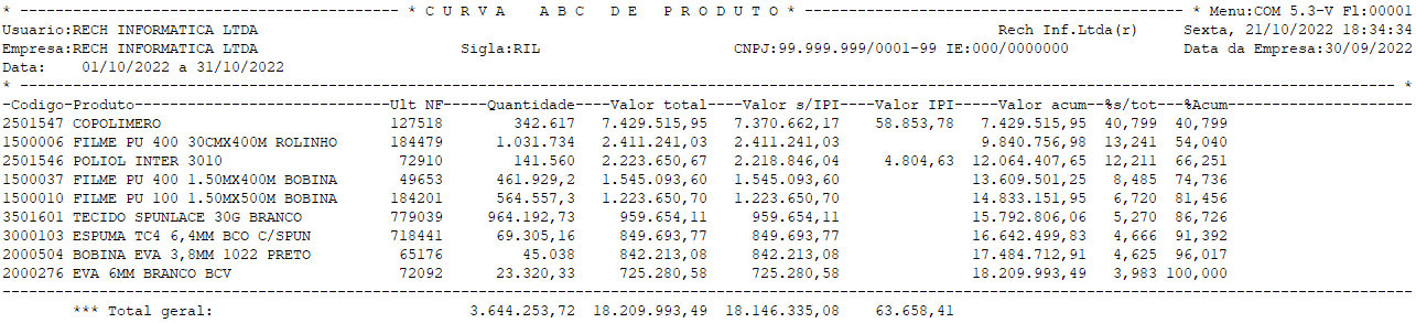 Disponível no menu COM 5.3-V, o relatório de análise ABC de fornecedores e produtos, em ordem crescente ou decrescente de valor total da compra, com prazo médio de vencimento simples e ponderado.