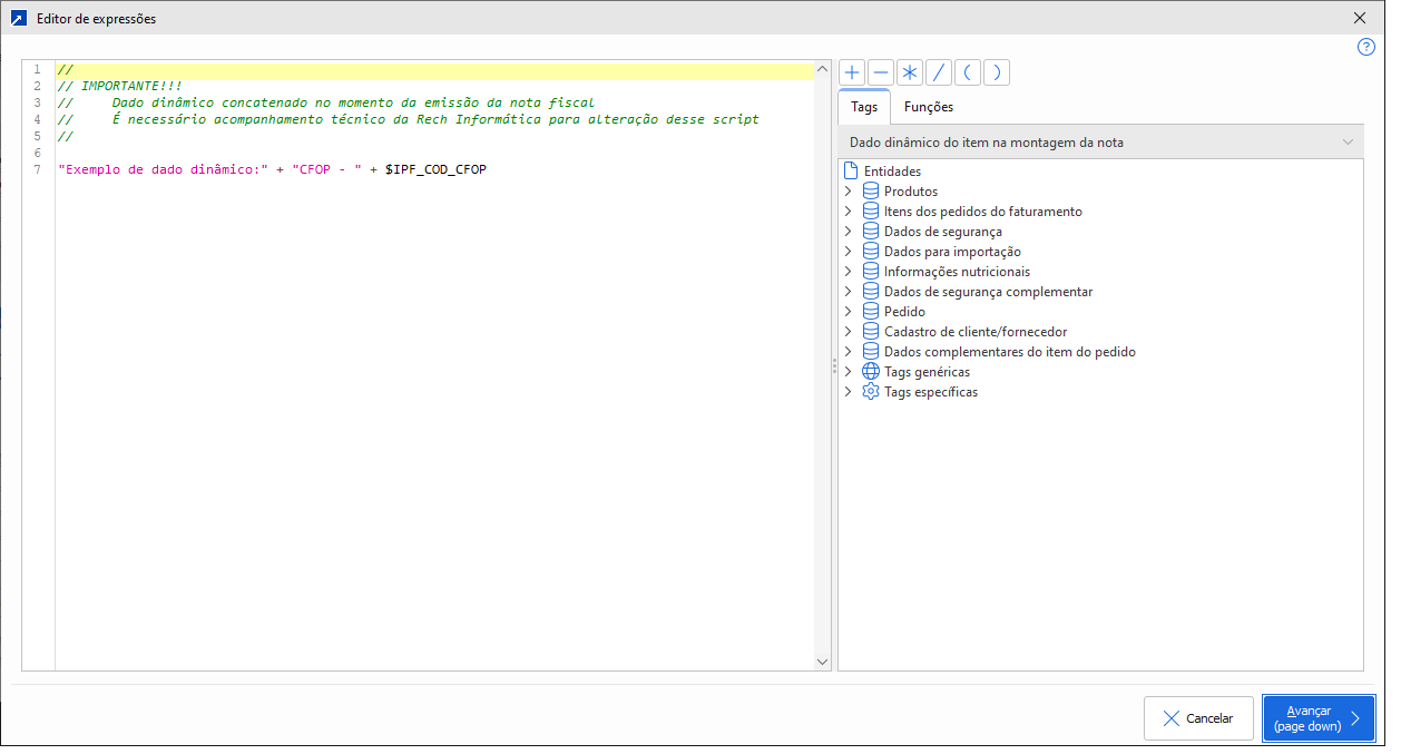 Dado Dinâmico O dado dinâmico propicia a montagem de expressões para utilizar no dados da nota fiscal. No exemplo acima o dado dinâmico montado é Exemplo de dado dinâmico CFOP - 5.101. 5101 foi um exemplo, mas listará a CFOP utilizada na nota.