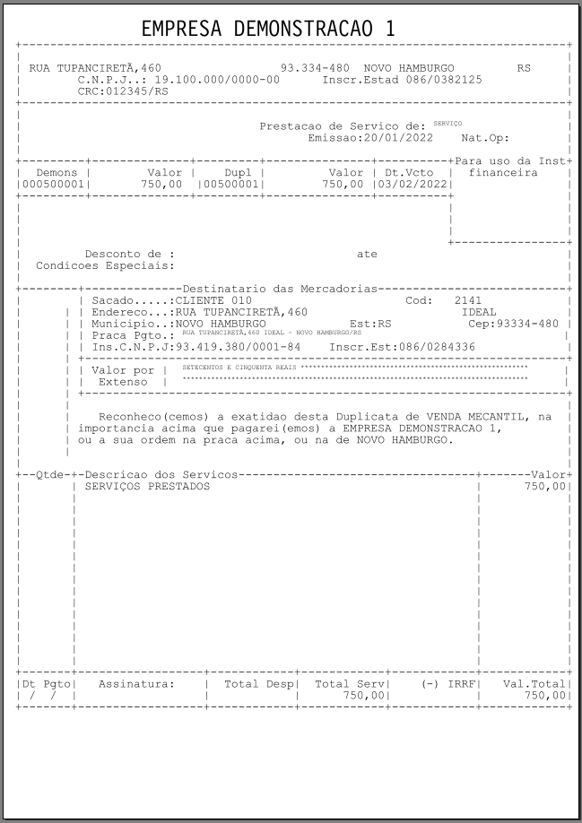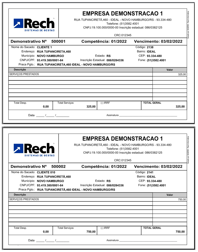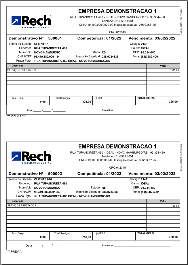 S-Meia Página (Saltando Página): Imprime formulário em meia página e salta a página quando emitir vários demonstrativos, conforme o exemplo do formulário a seguir.