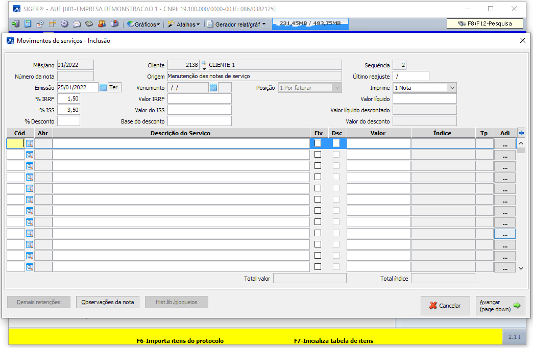 Se marcado, é possível selecionar serviços nos itens do protocolo e posteriormente importa-lo na nota de serviço. Na manutenção dos movimentos de serviços, passa a estar disponível a função "F6-Importa itens do protocolo", conforme demonstrado na imagem a seguir.