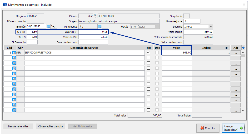 Informar neste campo o percentual de IRF padrão para notas de serviço.