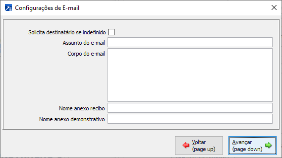 Este botão acessa as configurações padrões para envio do e-mail, este botão é habilitado somente quando selecionado os campos "E-mail para recibo", "E-mail p/demonstrativo" e "E-mail para nota não eletrônica".