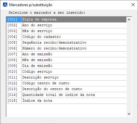 Nome anexo recibo: Nome de arquivo sem extensão para recibo de serviços, se deixar em branco para usar estrutura padrão do SIGER®, neste campo está disponível os marcadores de texto, através da função F4-Marcadores na linha amarela.