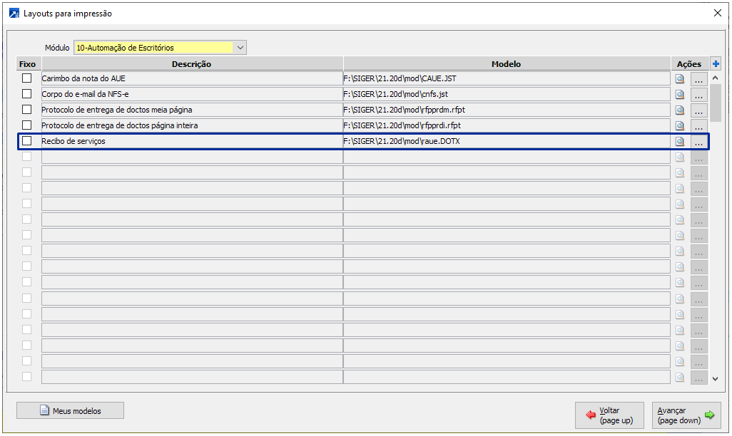 Este formulário é configurado no menu AUE 1.2-A, botão <Layouts de impressão>, no campo "Recibo de serviços", conforme demonstrado nas imagens a seguir.