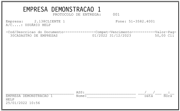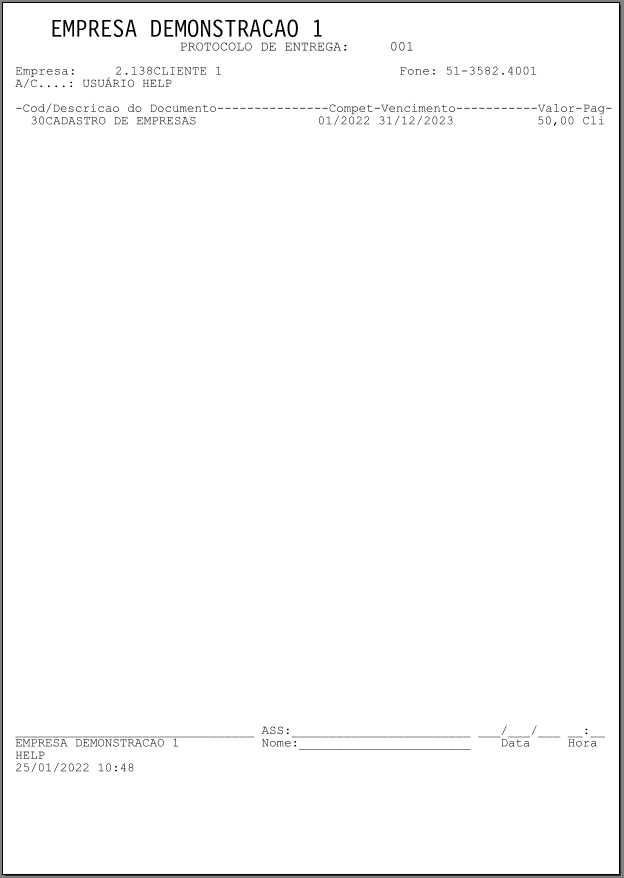 M-Meia Página: Imprime formulário em meia página, se emitir vários demonstrativos, os mesmos serão impressos em sequência, conforme o exemplo do formulário a seguir.